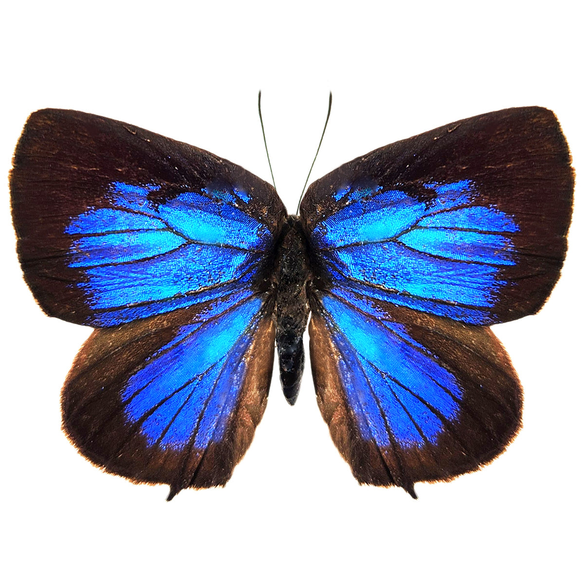A petite sized royal blue-violet butterfly from tropical Asia. This butterfly has minimal sightings. Their habitats are fairly humid and warm. The blue on their wings is iridescent, sitting atop black bordering wings. A new Arhopala species for us, make sure to grab a couple while we have them available!
