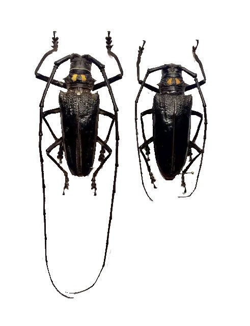A deep black colored longhorn beetle fro Sangir. Like other longhorns, Male's antennae are larger and exceed its body length, female's only slightly do, but not by much. On their pronotum, directly behind their heads lie a pair of small orange oval-like patches, which can be seen on both Male's and Female's. From head to abdomen, these pairs come to about 50-55 mm. Limited pairs available!  Temp image credit by BeatleJames, new image coming soon!*
