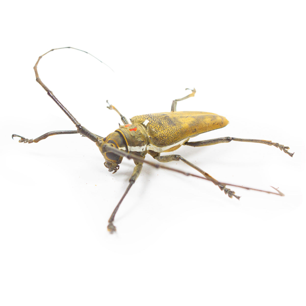 A dusty, cardboard brown coated longhorn beetle from Indonesia. They exhibit 2 distinct red marks atop their thorax, a white spot on their mid-upper abdomen, and at the side (see pic 2) there is a white stripe on the side of its abdomen that is hard to miss! Brand new to us, great for your collection!