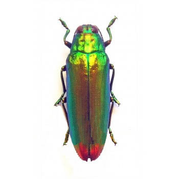 A metallic green jewel beetle with a red reflective coloration in its upper mid-elytra casing down to its red-fiery end tips. These Jewel's come to us from Sulawesi, Indonesia. Brand new to us, make sure to grab a few while we have them! Temp image credit to Natur Showroom, new image coming soon!*