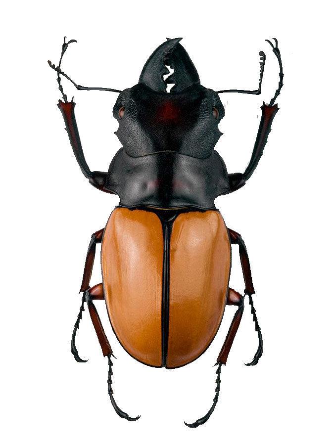 A black. and brown colored beetle from Thailand. Variations in mandible size, these examples have shorter but thick-sized pincers.