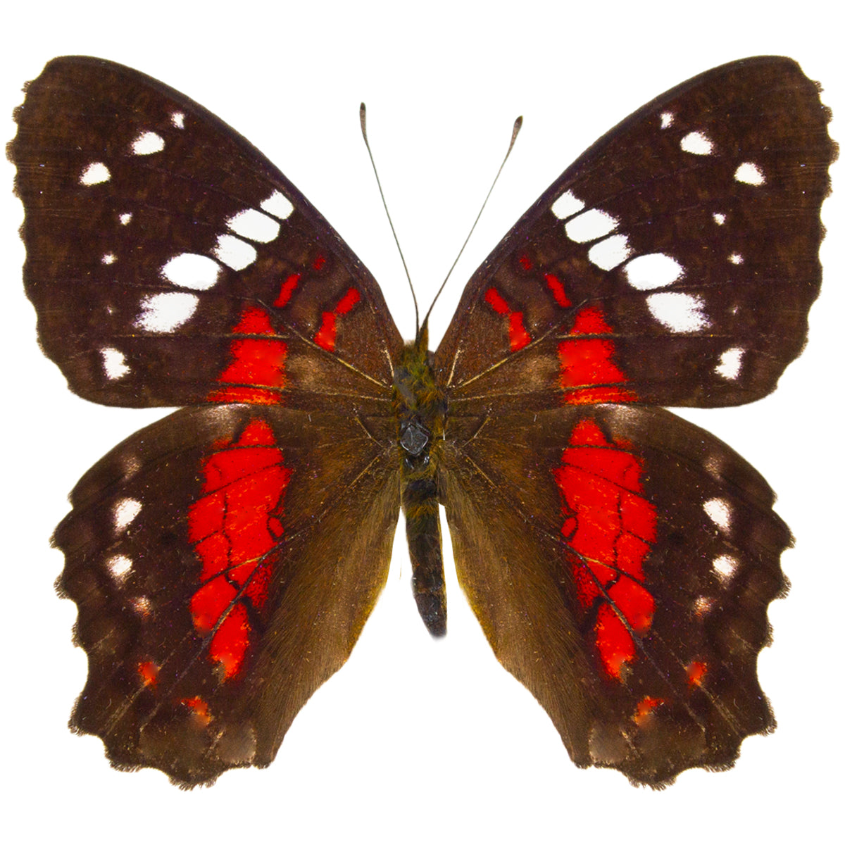 A jeweled red peacock butterfly from South America. A beautiful scarlet red, with white accents in its wings!