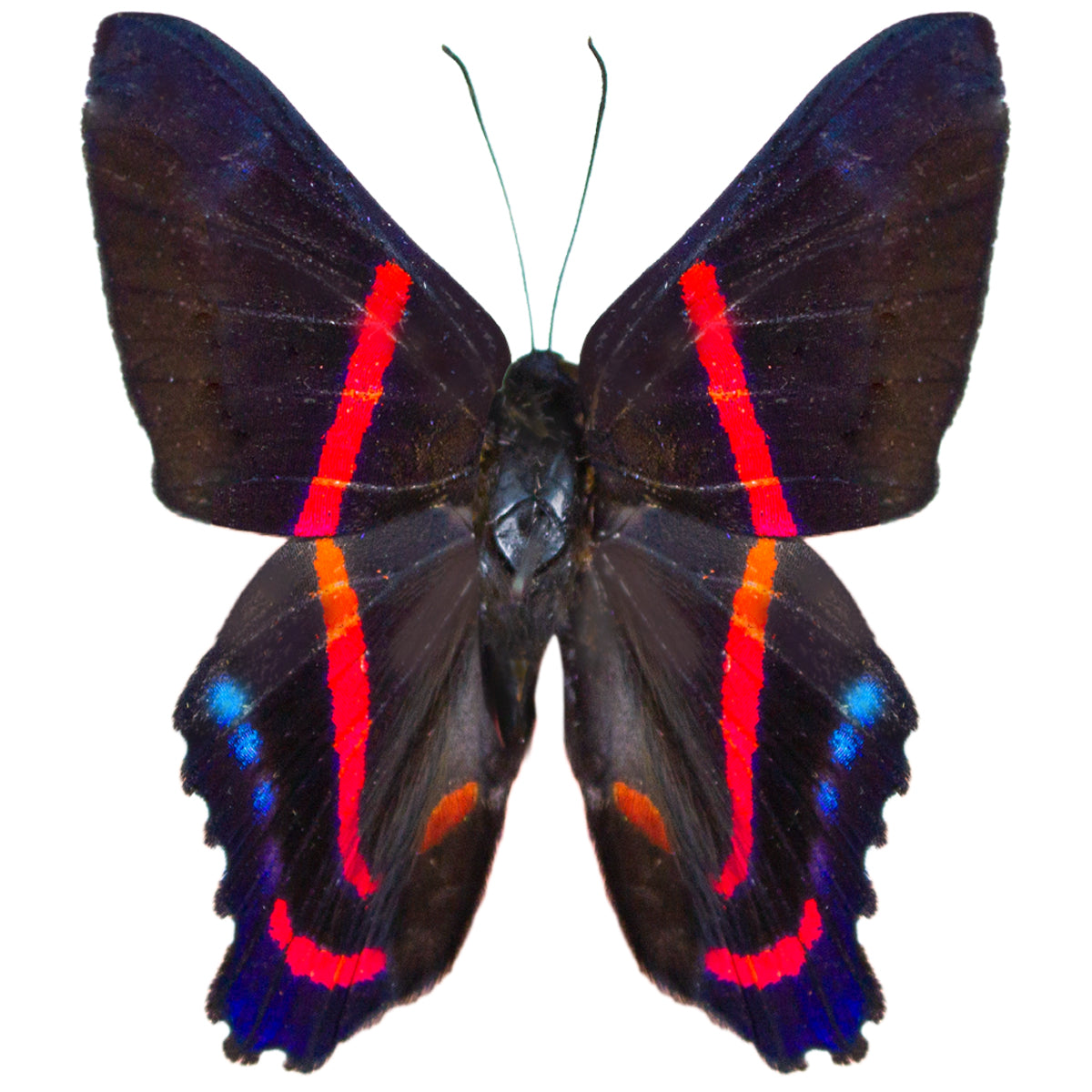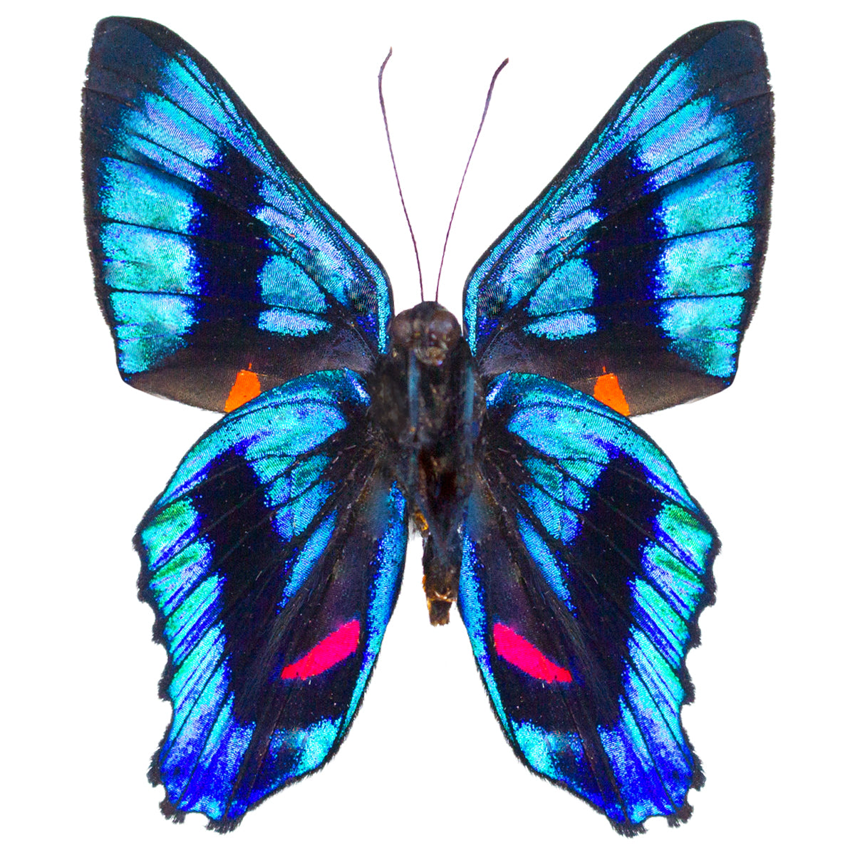 A petite sized metallic blue butterfly from Peru. The underside verso view exhibits a shiny galactic blue coloration, like a blue jewel, with some red patches on each wing. On the topside it is a deep brown-black with red lining. A returning butterfly and quite popular amongst collectors!