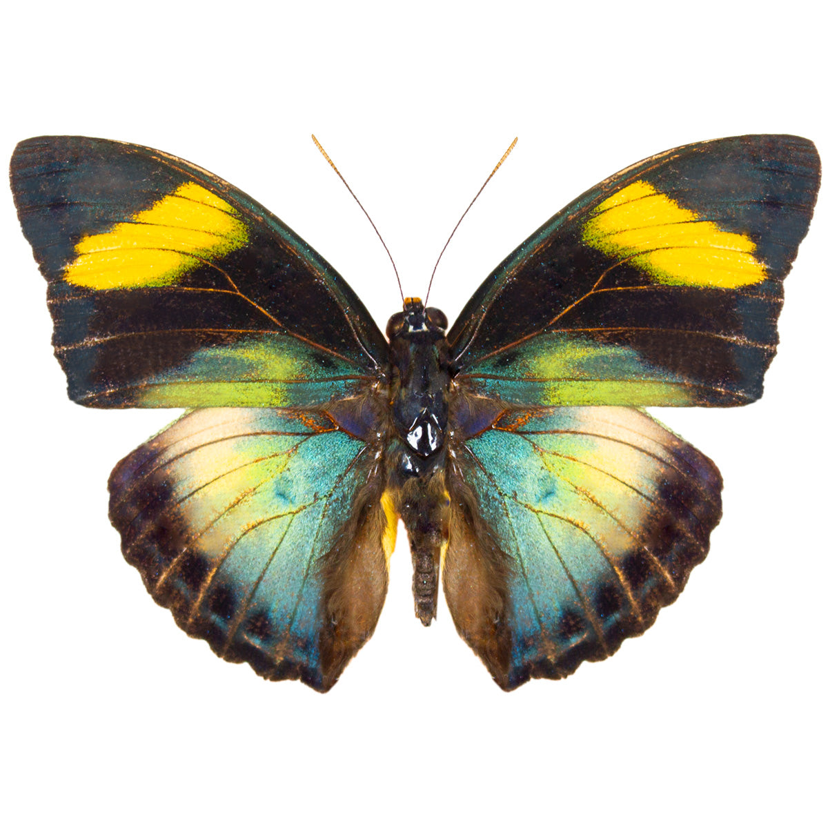 A moody, green-blue colored, dark winged butterfly from Africa. Its recto forewings have a diluted yellow stripe, and a glowing green- blue hue from lower forewing edge to inner mid-hindwing region. Underneath (verso) they are a diluted olive green with vanilla dull cream forewing-arch patches, dark black markings-in both wing sets with more dull vanilla coloration in its hindwings. Any view of this Forester is eye-catching! Brand new to us, great for any collector! Limited quantity, grab these few fast!