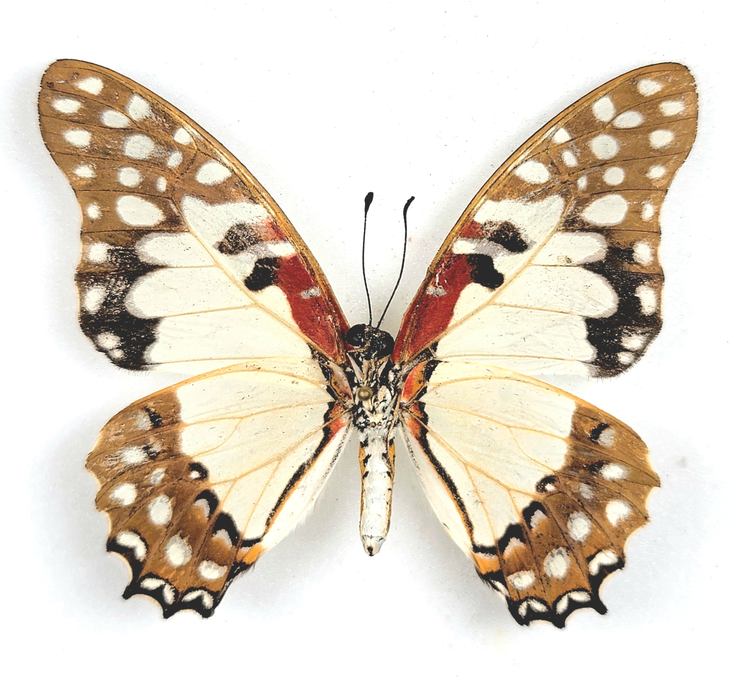 A beautiful, dark winged, white patched and spotted swallowtail butterfly Central Africa. Underneath they are tirimasu dessert colored mixture of browns and cream white patches, and a small hint of red coloration sitting in its underside forewing. A lovely, ethereal feel to this angel! New to us, NP, A- quality!