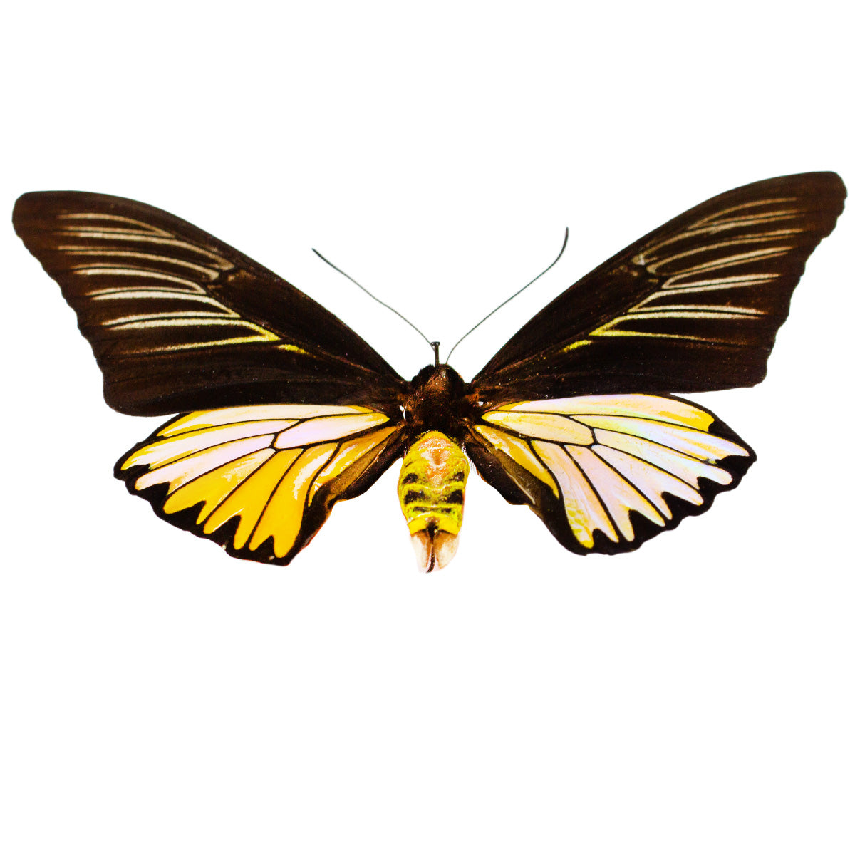 CRJM-TPRAT: A large, elegant velvet dark brown winged birdwing  from Mandoro. Males have velvet wings with tan-cream highlights that surround its veining and hindwings are dark winged with yellow large patch divided by brown veining. The special quality on this birdwing is its opal-sheen to its hindwing, quite captivating in person! This specimen was collected in 1971! From the J.Mullen Family Collection, you will receive this exact specimen  SPREAD as shown! Data tag included with this specimen.