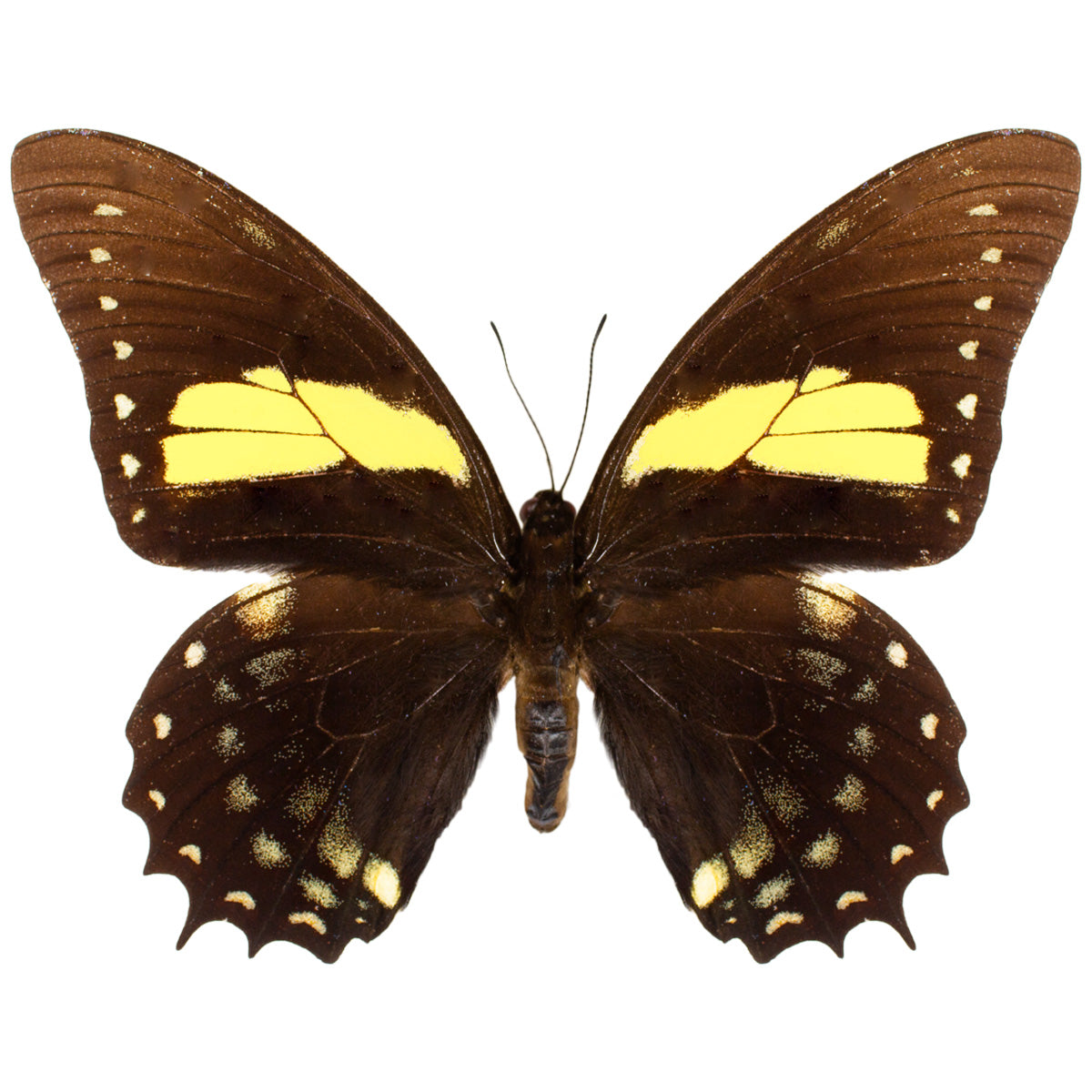 With sharp frills on its hindwings, this RARE swallowtail butterfly has a remarkably unique appearance! Its smoky yellow and black wings is thought to mimic the warning colors of toxic species as a means of deterring predators.