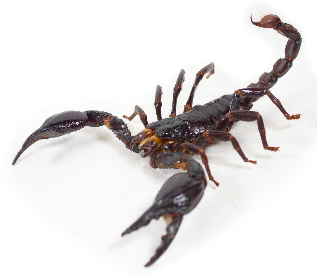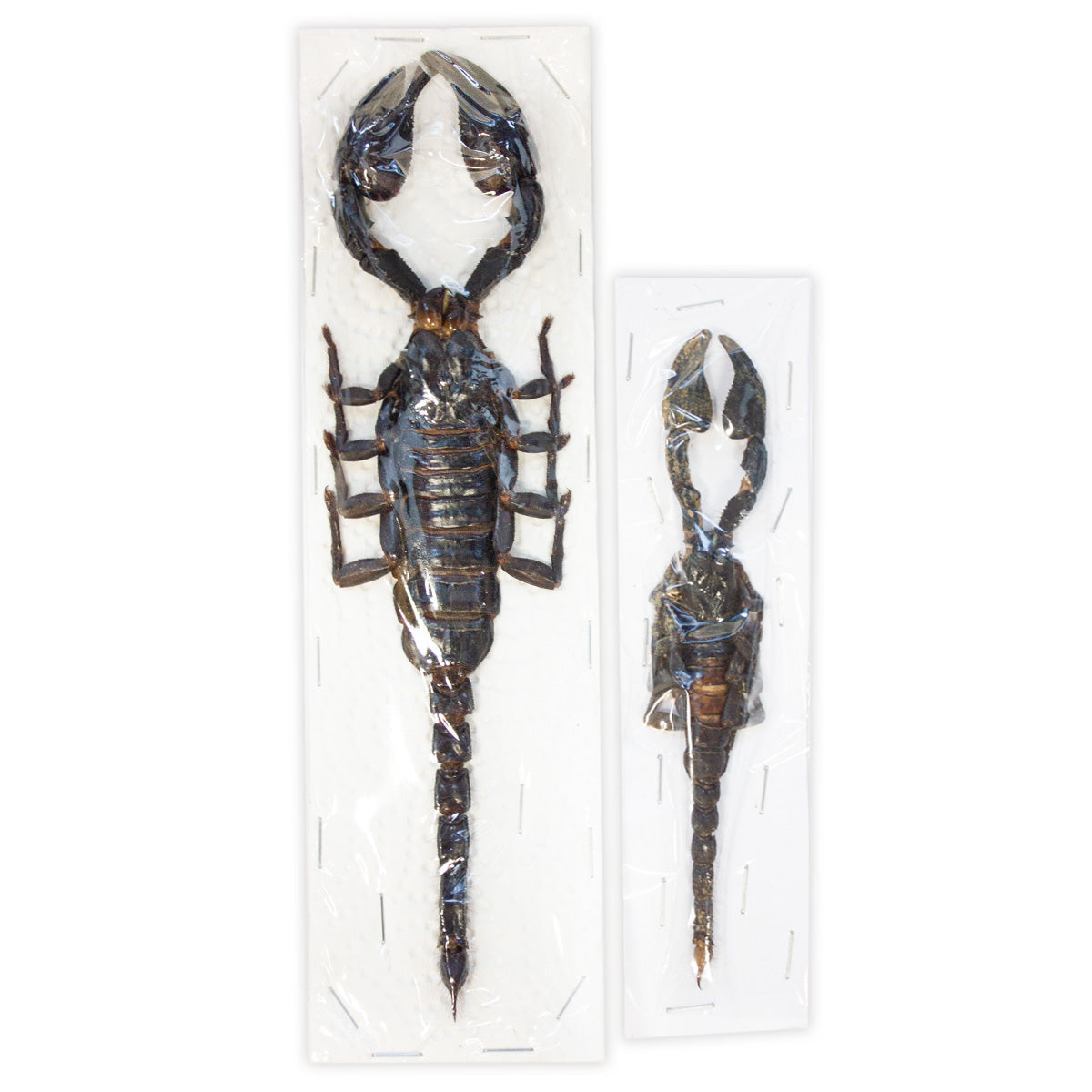 The famous forest scorpion; a deep tar black-purple in color, and a wonderful addition to any art piece or collection! They are also eaten as a delicacy around Asia. These examples are bit smaller than the standard sized scorpion, measuring at 124mm in length! Small but cute!