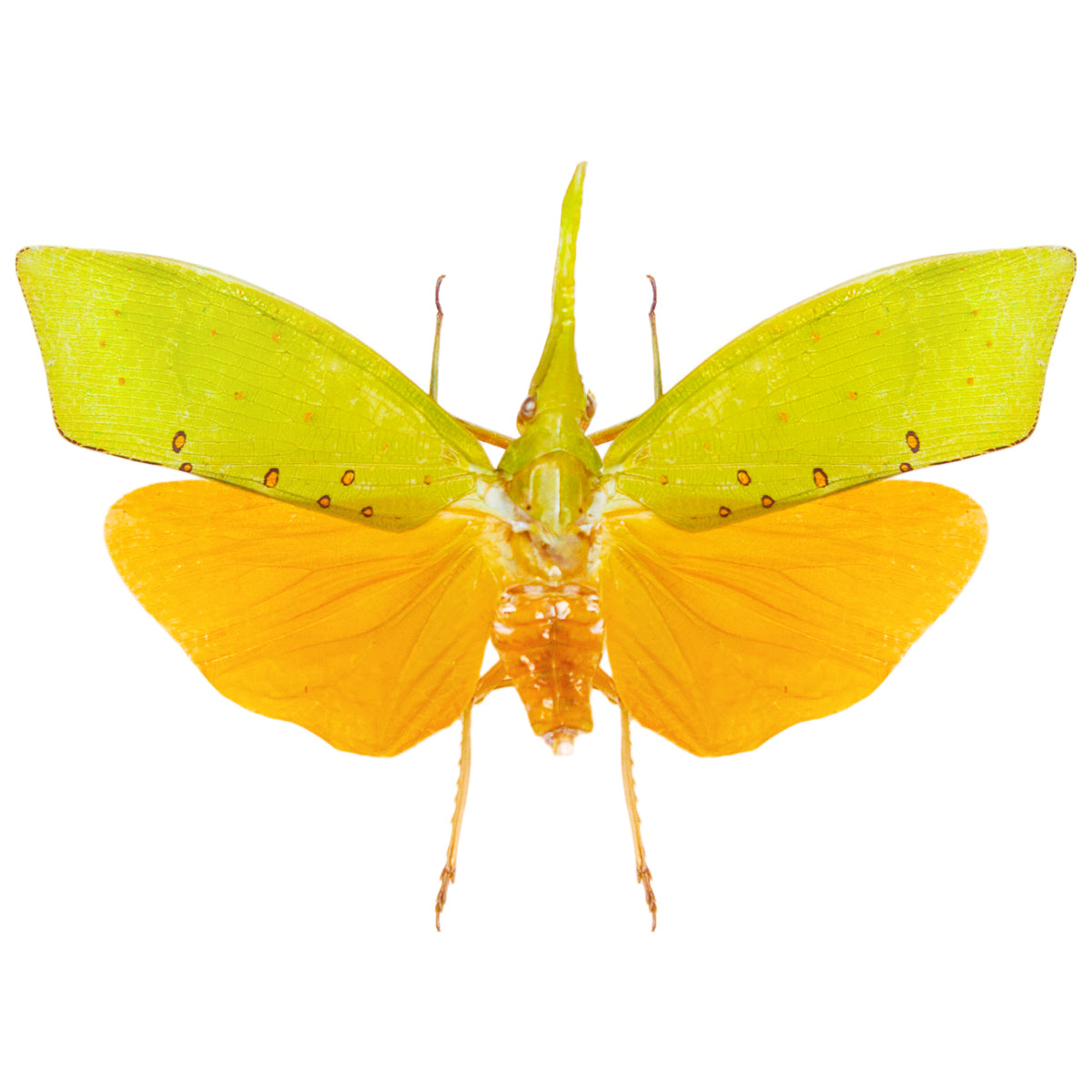 Vibrant leaf green and yellow color winged plant hopper from Malaysia. Their bright wing coloration scare predators away, helping them escape being devoured. Brand new to us!