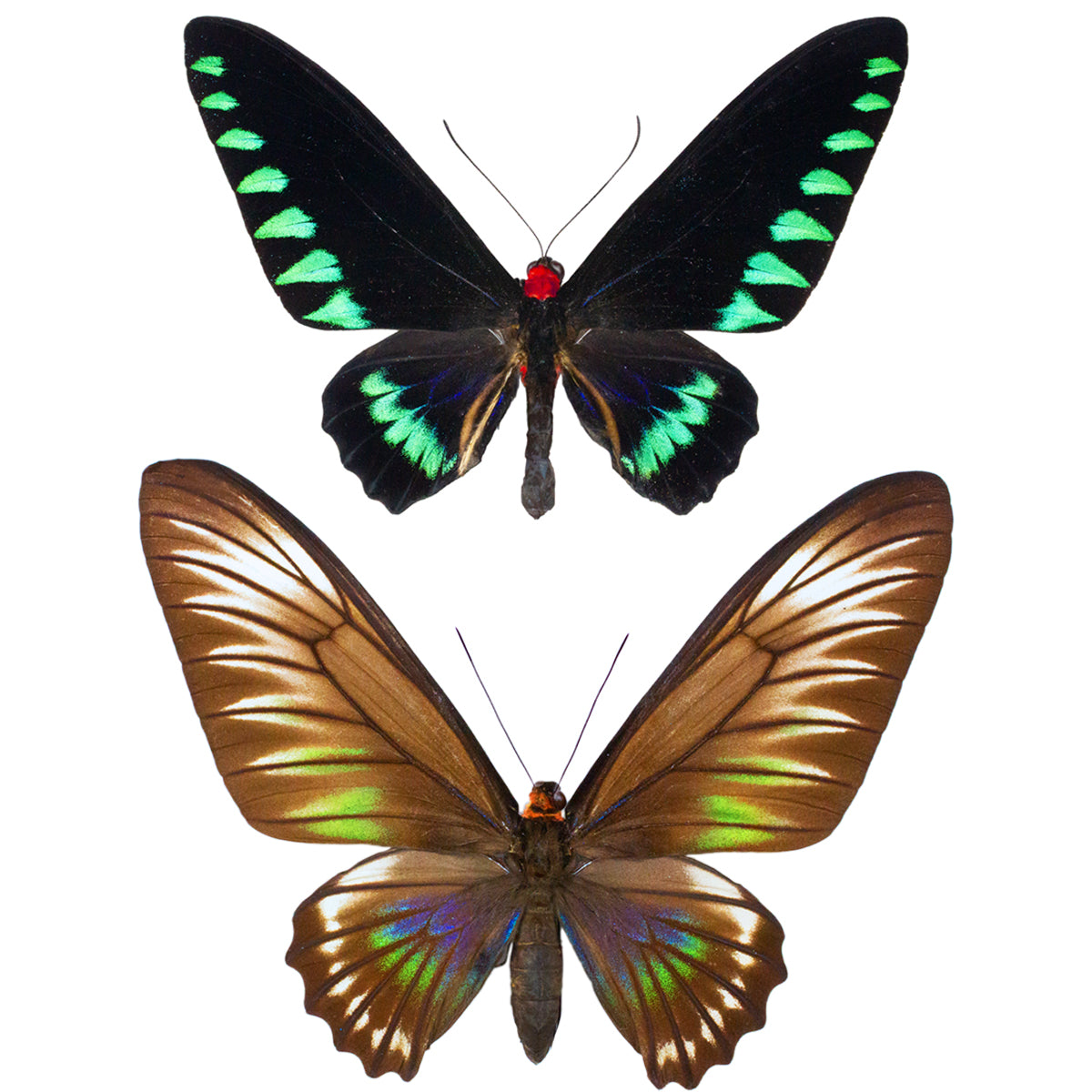 A beautiful Palawan Birdwing pair! Males are black winged with green triangular patches along their wing edges while females are large, brown, and have a sight rainbow green-blue zig-zag design atop their beautiful wings, a hazy vein brown zig zag patten can be seen from their forewing to hindwing. A returning favorite in great condition! Don't miss out on these while we have them!