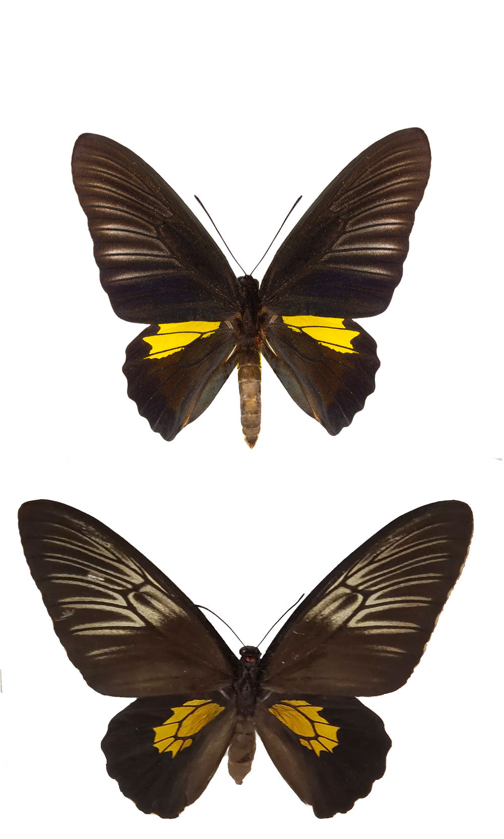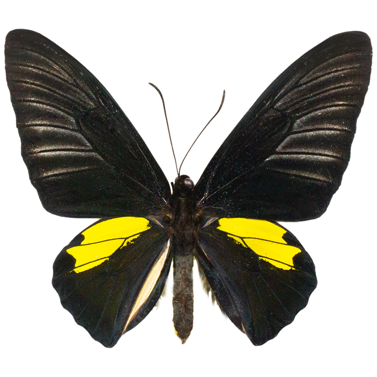 Dr. Platen's Birdwingi is a Troides species endemic to Palawan in the Philippines. It has large brown wings with minimal chalky veining in the forewings and a bright yellow patch in their hindwings. They can be found in wooden habitats and are a protected species by CITES law. A good amount available, don't miss out on this new birdwing while we have them! This listing is for a Male + Female pair in great condition!