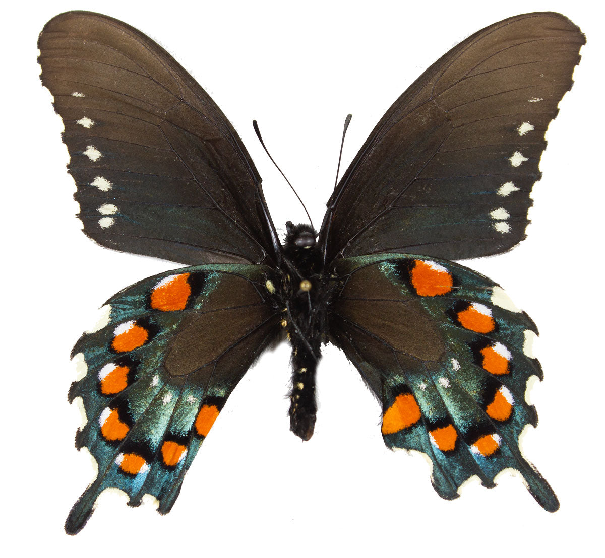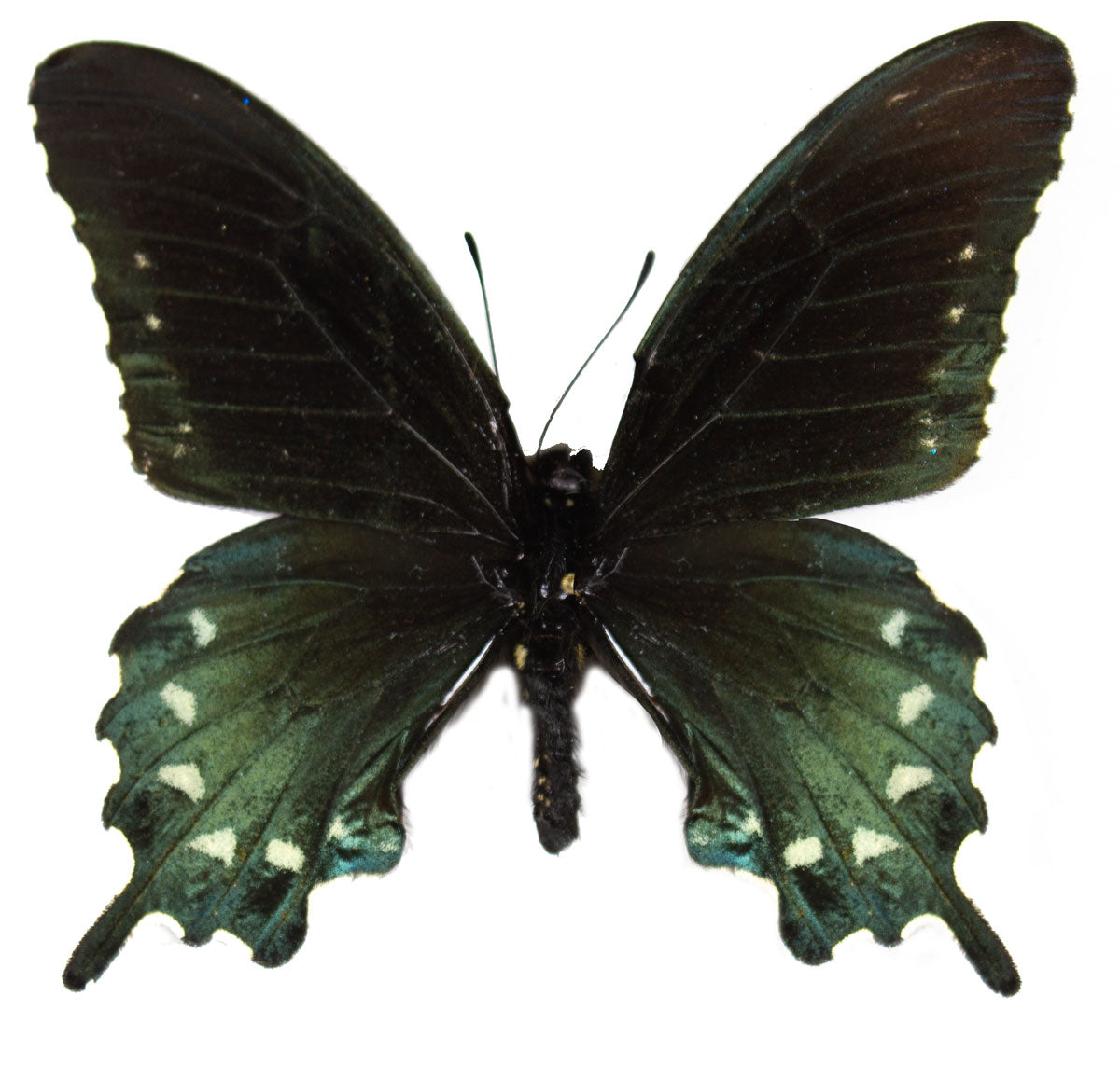 A black winged swallowtail with moody iridescent green at its hindwing undersides and red-orange patches within. The top viewing of these all black with dark teal hindwing coloration and dull cream patches along the wing ends, the green in the males is more vibrant compared to their counterpart who lack it. Known as forest dwellers, they can be found in warm areas and are widely distributed in the United Sates, with some occurrences towards Canada. A returning favorite, make sure to grab a pair due to limited quantities!