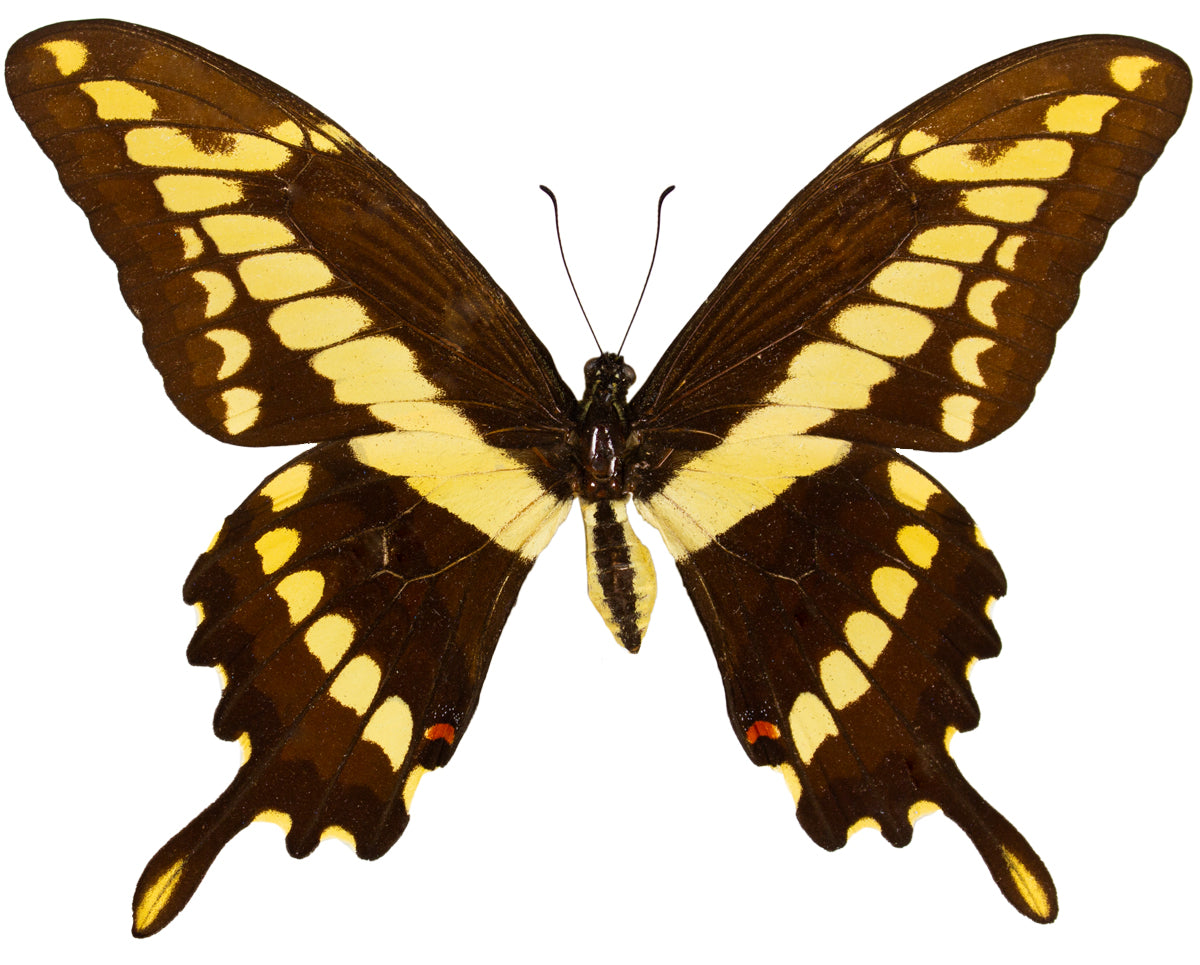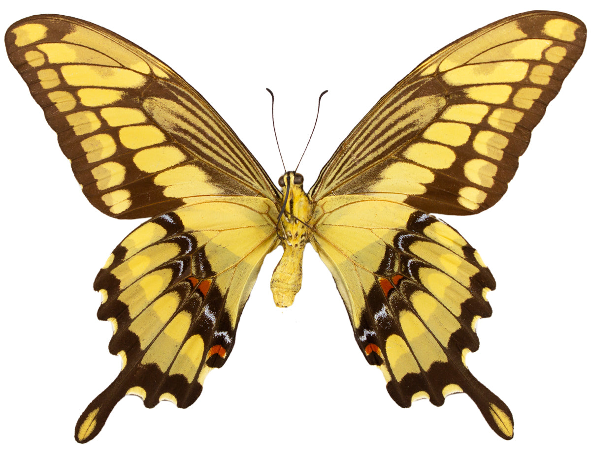 A yellow barred and banded, brown winged swallowtail from North America. This species is widely distributed and dispersed amongst mountain hillsides and flat, lowland forests. A striking swallowtail from front to back, predominantly yellow and less of brown underneath. A lovely addition to any collection!