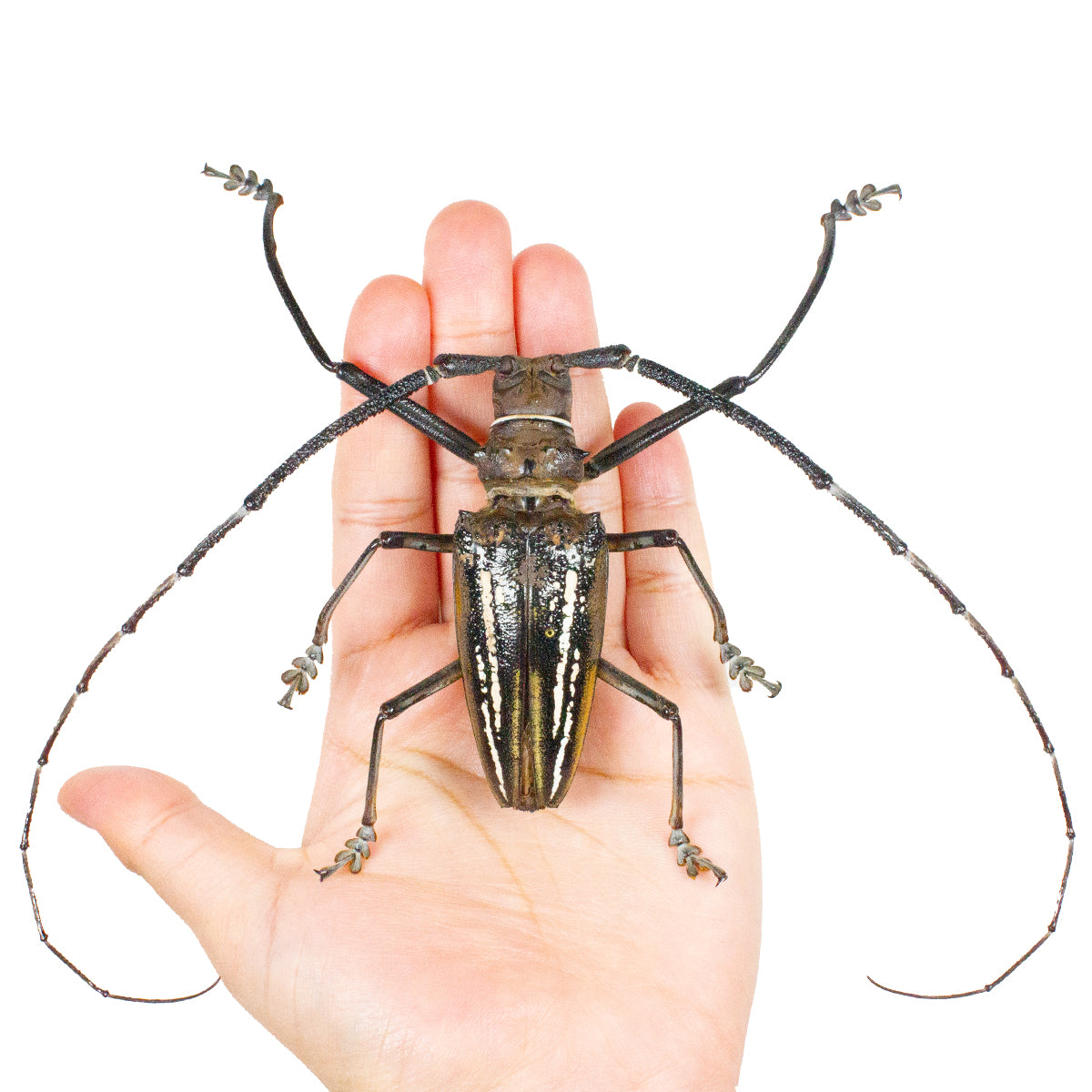 CRTBC-BW065: Wallace's Longhorn is a beautiful flat-faced longhorn beetle from Indonesia. Male's have large antennae that surpass their body length, whereas female Wallacei's are shorter. They are light craft brown in color with black and white "graffiti"patches on their shell tops. This is our 2nd lot listing for this specific beetle. You will receive this exact preserved specimen spread as shown from the TBC House Collection.
