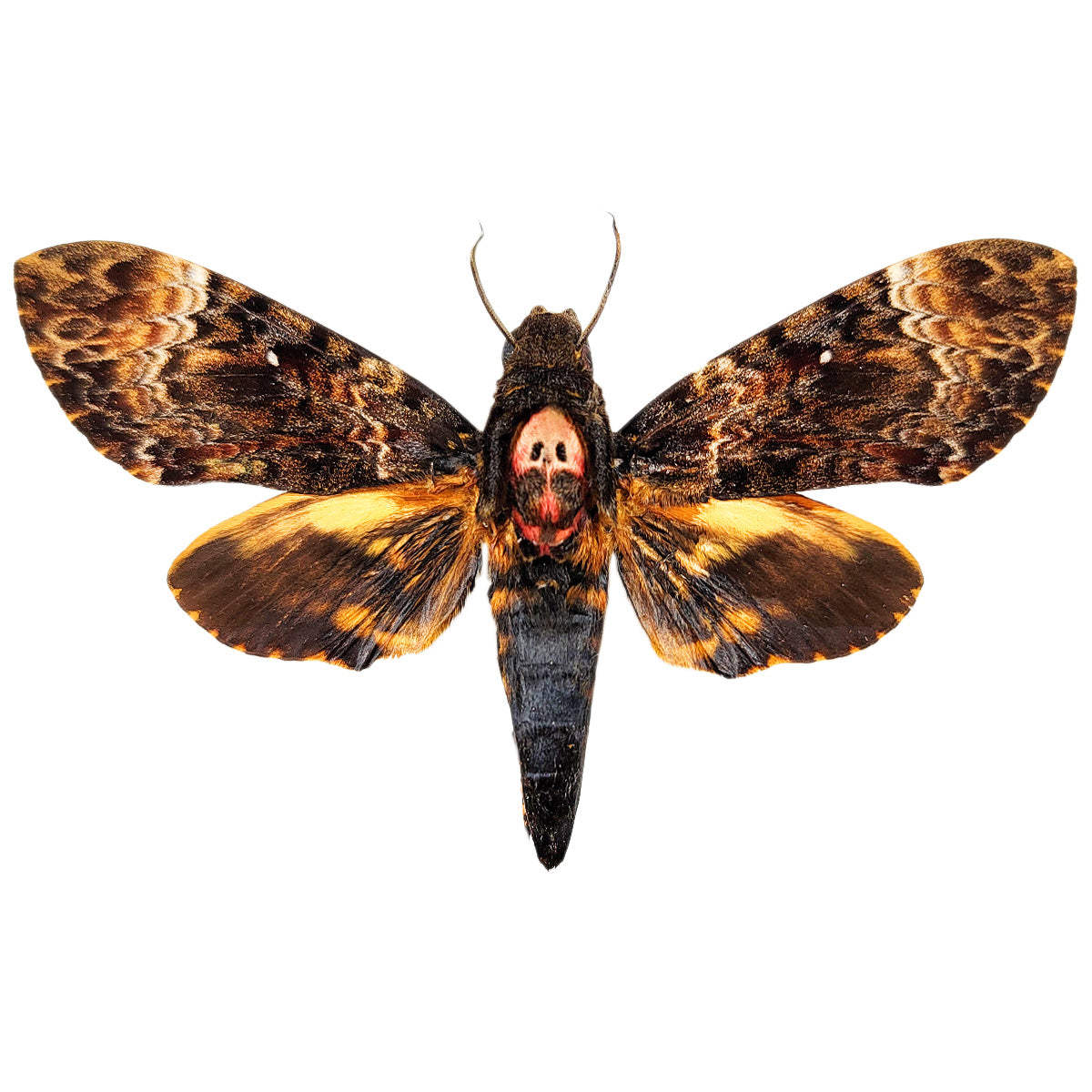 We sell dried butterflies and moths packaged in glassine envelopes with their wings closed (not spread) and antennae intact but not guaranteed because of their fragility or the quality selected. Other insects are set on cardboard covered with cellophane, legs and antennae tucked close to the body. Spreading and posing options are available at the time of purchase.