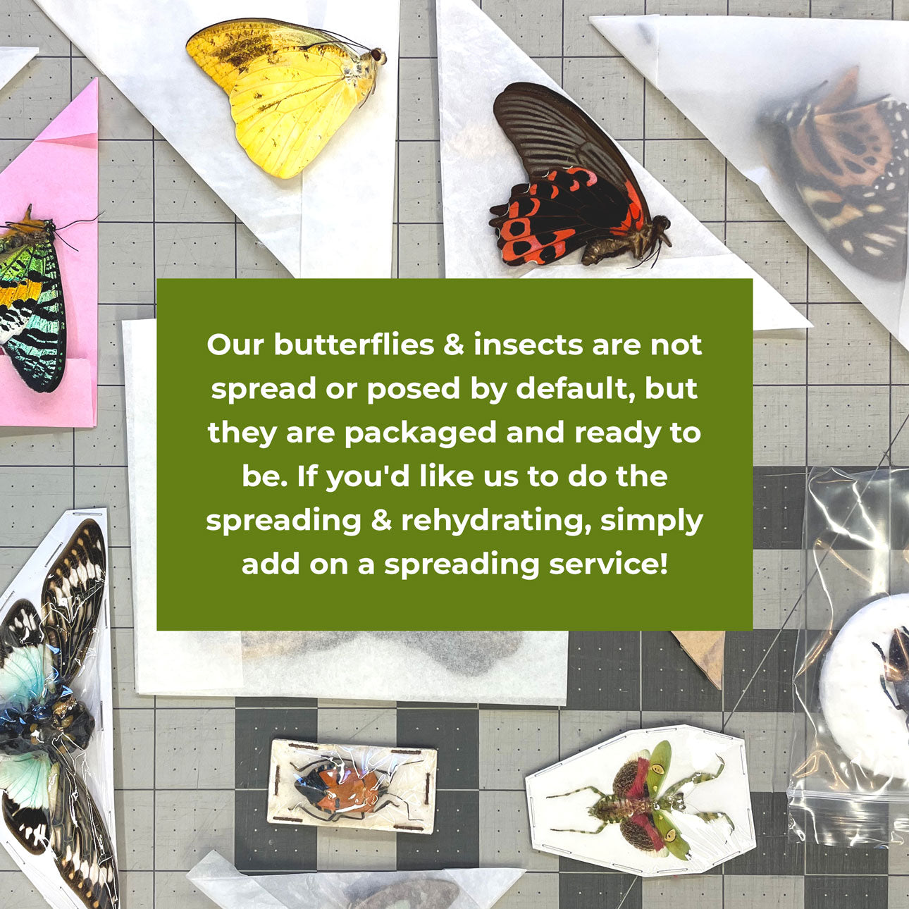 *Note: By default our butterflies and insects are not spread. They arrive folded in paper sleeves. If you'd like them rehydrated and spread, please add on a spreading service at checkout. Because this is a bespoke process, it will add several days to your order. We appreciate your patience!