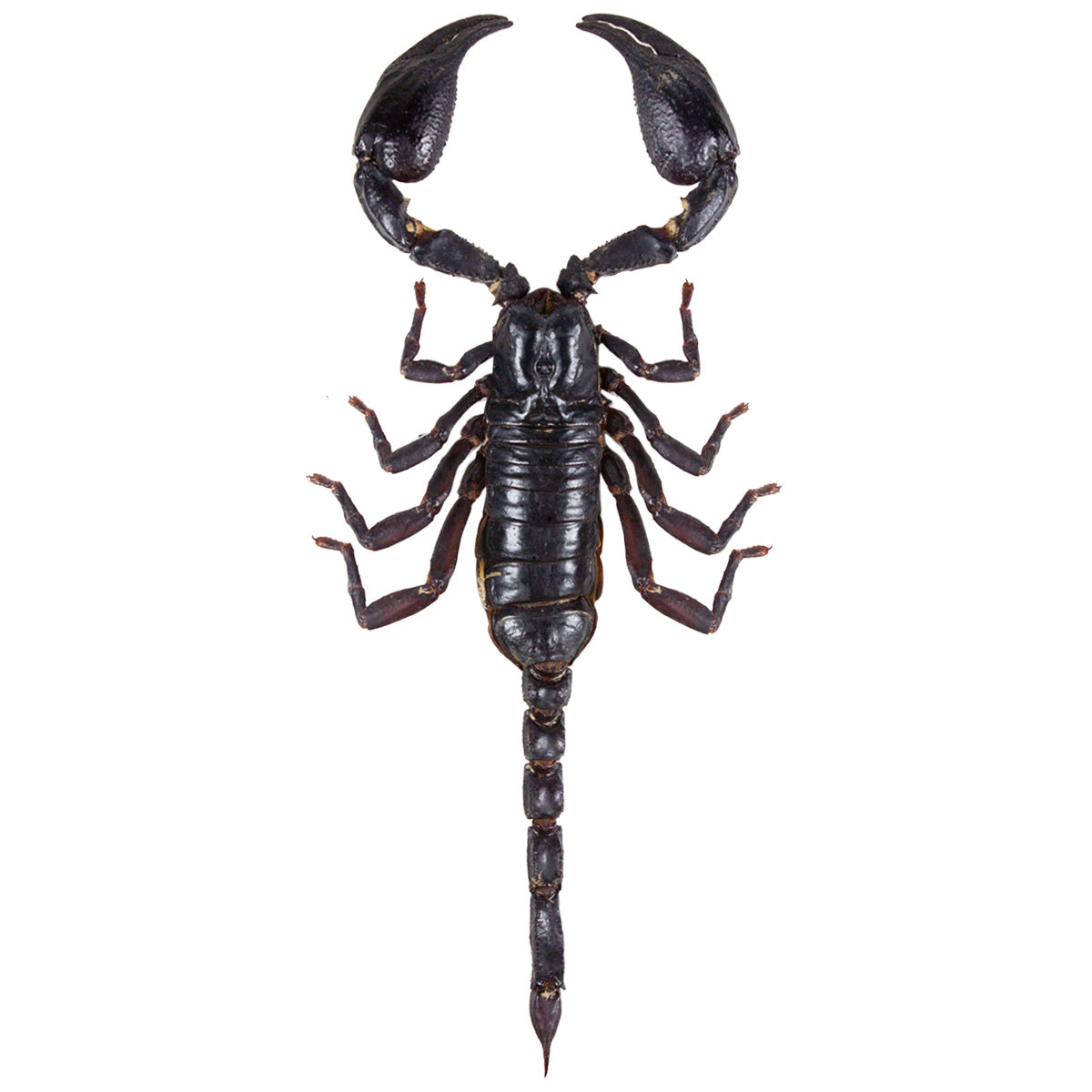 The famous forest scorpion Thailand; they are large, deep tar black-brown and a wonderful addition to any art piece or collection! They are also eaten as a delicacy around Asia. These are a little bigger than our standard scorpions measuring 160mm in length. An aggressive species when approached, even by its own, there is even evidence of it consuming its own!