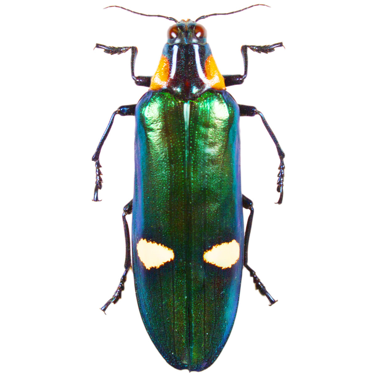 The bicolor jewel beetle is splendid; it has glossy brown back with a small yellow spot on each side. These are male jewel beetles that are from Thailand and are 55 to 65 mm in length, one of the biggest jeweled beetles out there! With the wings spread they are VERY impressive!