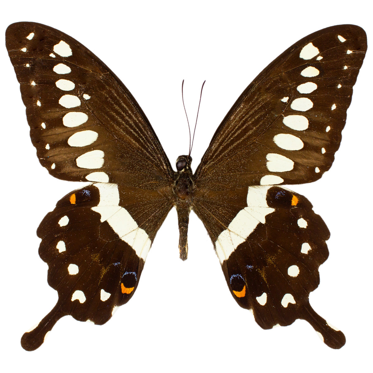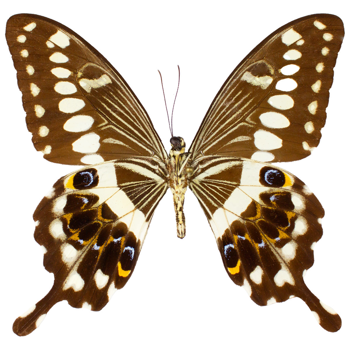 A cream-banded, patched brown Afrotropical swallowtail butterfly from Africa. The undersides are quite exquisite compared to its frontal view. Its numerous eyespots on its lower underside hindwing are our favorite detail! A lovely addition to any collection!