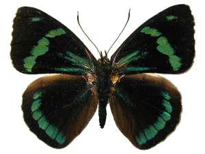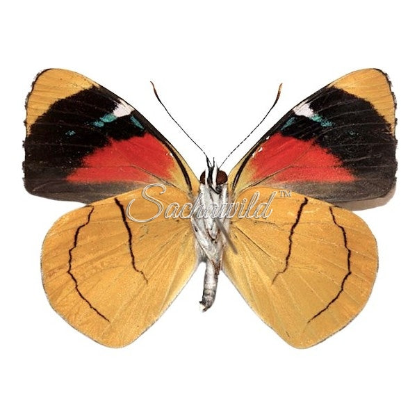 A black winged, metallic aqua-blue banded, petite butterfly from Peru. Their underside wings are a bright golden yellow, with thick velvet black, wide forewing bands and inner red coloration with blue whispers of color within its black areas. Their hindwings have 2 sets of thin black linear stripes on each side. Not new for us, but a good returning butterfly!  Temp image credit to Sachawild website, new image coming soon!*
