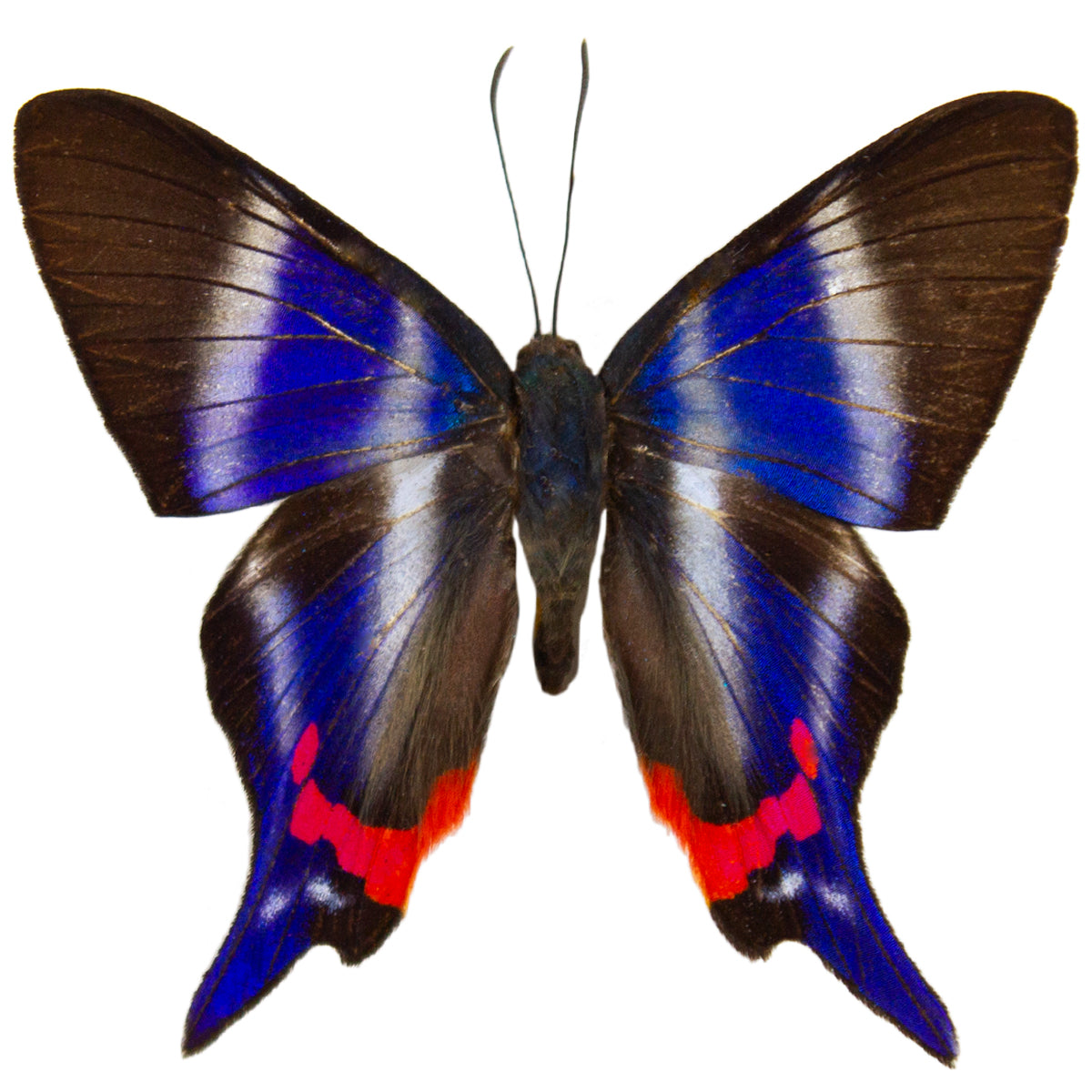 A beautiful little butterfly with blue and white vertical stripes and some red coloration at its tail ends. Periander is one of few Rhetus species that is the most common and widespread species of its kind. A returning butterfly to our shop, make sure to grab a couple while we have them!