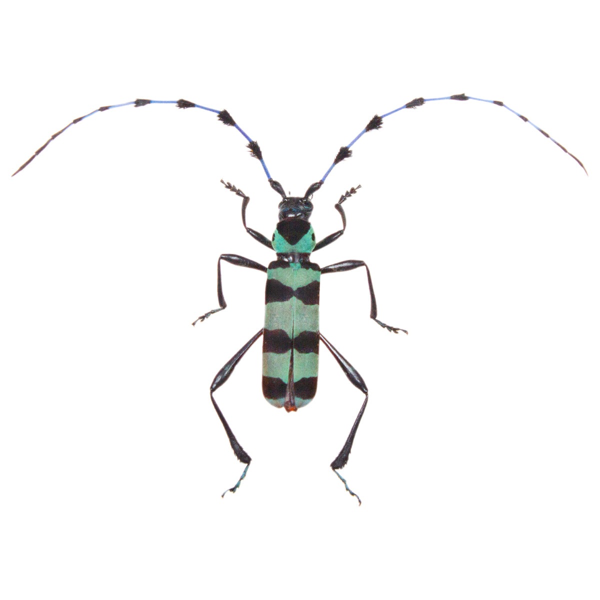 A concrete grey blue colored longhorn beetle from Malaysia. They have long antennae, black banded stripes from thorax to abdomen. Their antennae surpass their body length and have small black pom poms on them. Blue variations exist but are more so darker compared to other Rosalia's. A lovely, petite-sized beetle, new to us, and great for any collection!  Temp image by BioLib website, new image coming soon!*